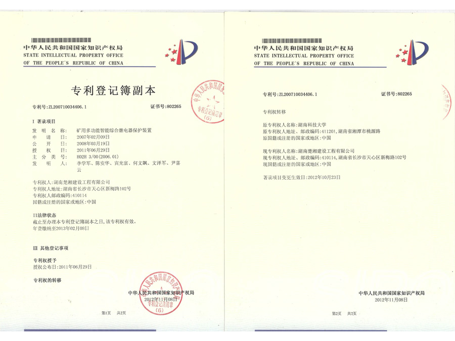 2011年6月29日,“礦用多功能智能綜合繼電器保護裝置”成功申請國家專利