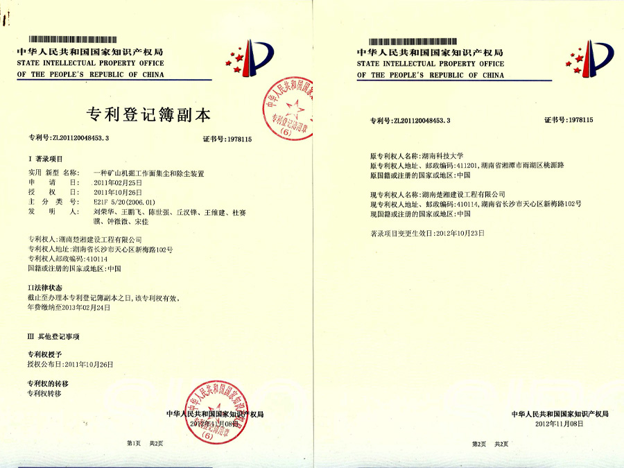 2011年10月26日“一種礦山機掘工作面集塵和除塵裝置”成功申請國家專利