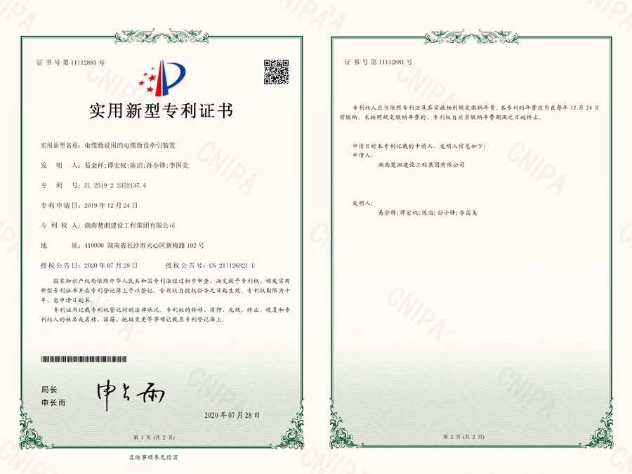 2020年7月28日被授予“電纜敷設用的電纜敷設牽引裝置”專利-2019223521374-實用新型專利證書
