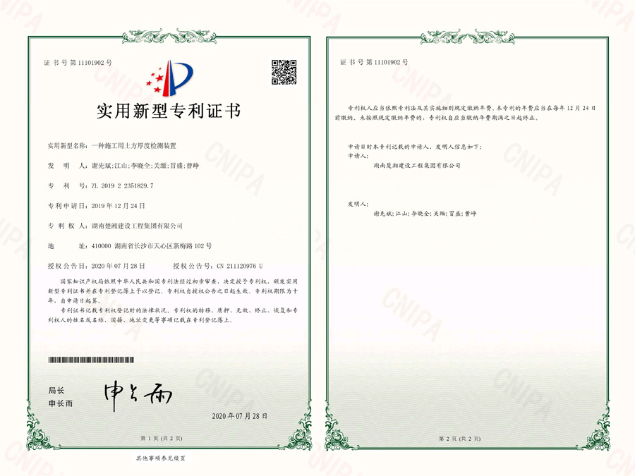 2020年7月28日被授予“一種施工用土方厚度檢測裝置”專利-2019223518297-實用新型專利證書