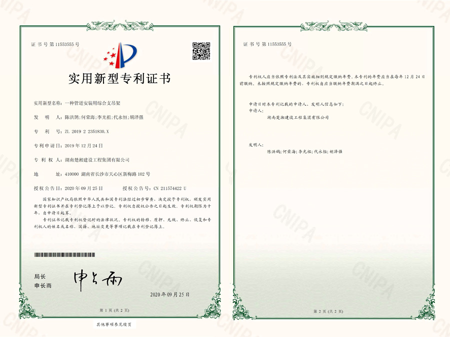 2020年9月25日被授予“一種管道安裝用綜合支吊架”專利-201922351830X-實用新型專利證書