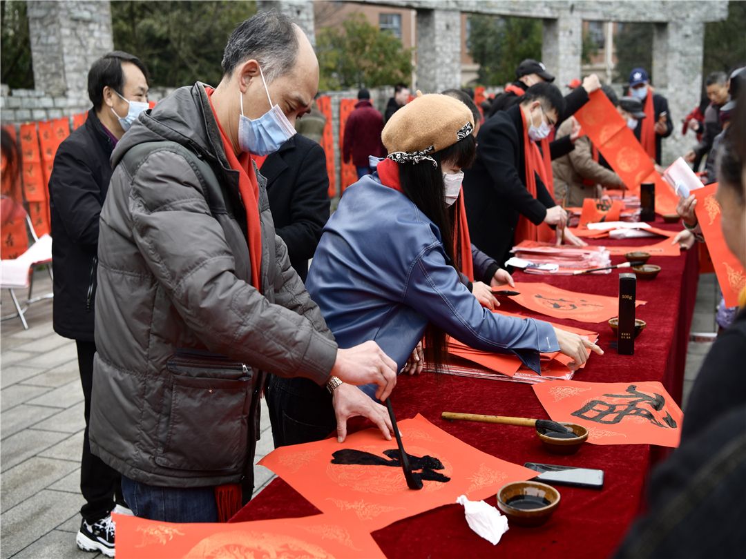 樂園廣場(chǎng),春意融融,20位書法家現(xiàn)場(chǎng)揮毫潑墨,上千幅寫滿新年美好祝福的春聯(lián)和“福”躍然紙上,既喜慶又充滿福氣。大家排列有序地向書法家迎請(qǐng)墨寶,工作人員在維護(hù)好秩序的同時(shí),親切的叮囑大家做好疫情防護(hù),積極宣傳有關(guān)疫情防控政策要求。當(dāng)?shù)鼐用窦娂姳硎荆瑢⒎e極配合政府、物業(yè)公司及當(dāng)?shù)厣鐓^(qū)做好自我防護(hù)工作。職工家屬們拿到贈(zèng)送的大紅春聯(lián)和“福”字后,個(gè)個(gè)喜笑顏開,溫馨的話語與歡樂的笑聲溢滿全場(chǎng)。